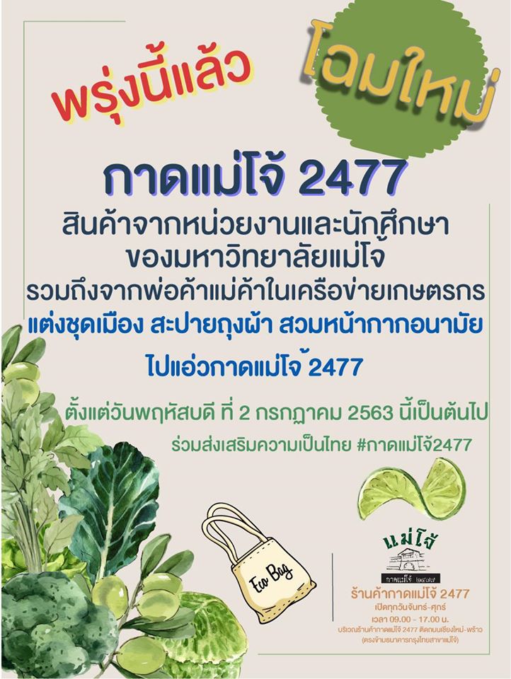 กาดแม่โจ้ 2477 โฉมใหม่ เจอกันวันที่ 2 กรกฏาคม 2563 ณ บริเวณลานจำหน่ายกาดแม่โจ้ 2477 (คาวบอยมาเก็ต)