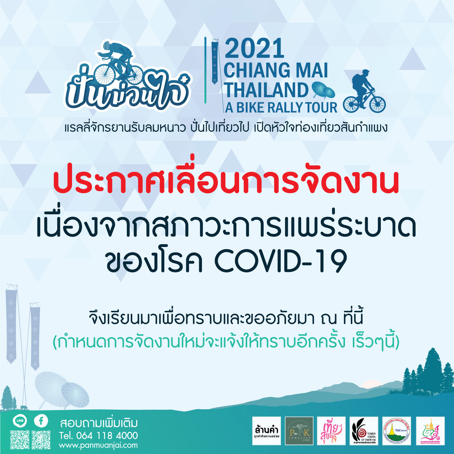สภาอุตสาหกรรมท่องเที่ยวจังหวัดเชียงใหม่ สมาคมส่งเสริมการท่องเที่ยวเชียงใหม่ และสมาคมธุรกิจท่องเที่ยวจังหวัดเชียงใหม่ (ผู้จัดงาน) รู้สึกเป็นกังวลกับสถานการณ์ที่เกิดขึ้น เราจึงจำเป็นต้องประกาศเลื่อนงานปั่นม่วนใจ๋ แรลลี่จักรยานรับลมหนาว