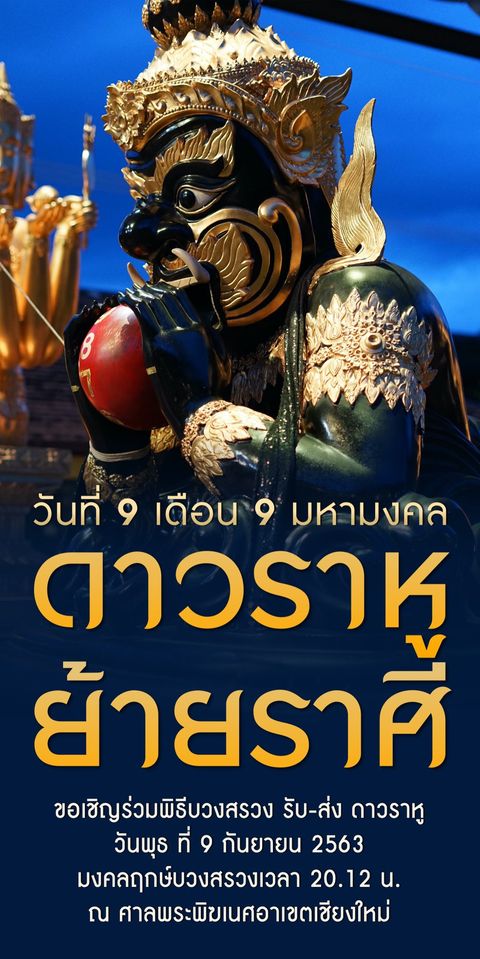 พิธีบวงสรวงดาวราหูย้ายราศี 2563 วันพุธ ที่ 9 กันยายน 2563 มงคลฤกษ์ 20.12 น. ณ ศาลพระพิฆเนศอาเขตเชียงใหม่