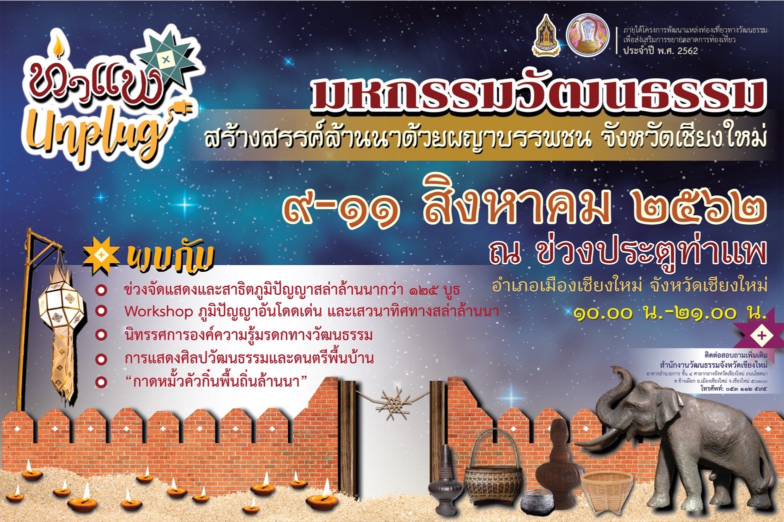 จังหวัดเชียงใหม่โดยสำนักงานวัฒนธรรมจังหวัดเชียงใหม่ สำนักศิลปากรที่ 7 เชียงใหม่และสภาวัฒนธรรมจังหวัดเชียงใหม่ร่วมกับแหล่งเรียนรู้ทางวัฒนธรรมในเครือข่าย กลุ่มสล่าล้านนาและเครือข่ายศิลปินพื้นบ้าน กำหนดจัดกิจกรรม Thapae Unplug ‘มหกรรมวัฒนธรรม สร้างสรรค์ล้านนาด้วยผญาบรรพชน’ ภายใต้โครงการพัฒนาแหล่งท่องเที่ยวทางวัฒนธรรม เพื่อส่งเสริมการขยายตลาดการท่องเที่ยวประจำปีงบประมาณ พ.ศ.2562