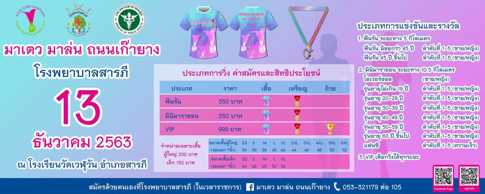 🏃🏻♀️วิ่งพร้อมกันวันที่13 ธันวาคม 2563 ณ โรงเรียนวัดเวฬุวัน ในราคามิตรภาพ 350 บาท หรือจะซื้อเฉพาะเสื้อเพื่อเป็นที่ระลึกหรือช่วยสนับสนุนกิจกรรมของโรงพยาบาลสามารถสั่งซื้อได้ในราคาตัวละ200 บาท(ของผู้ใหญ่) สำหรับเด็กตัวละ150บาท (เด็กที่ผู้ปกครองสมัครร่วมวิ่ง350บาทสามารถใส่เสื้อมาร่วมวิ่งกับผู้ปกครองได้โดยไม่มี bibและไม่ได้เหรียญเพื่อให้เด็กได้ร่วมออกกำลังกายด้วย) สำหรับเสื้อสามารถสั่งซื้อได้ทางเวปและมีวางขายที่ในโรงพยาบาล(งานเวชศาสตร์ครอบครัวห้องเบอร์13)และที่ร้านมิตรรักหน้าโรงพยาบาลสารภีโดยจะวางจำหน่ายในวันจันทร์ที่ 14 กันยายนเป็นต้นไป