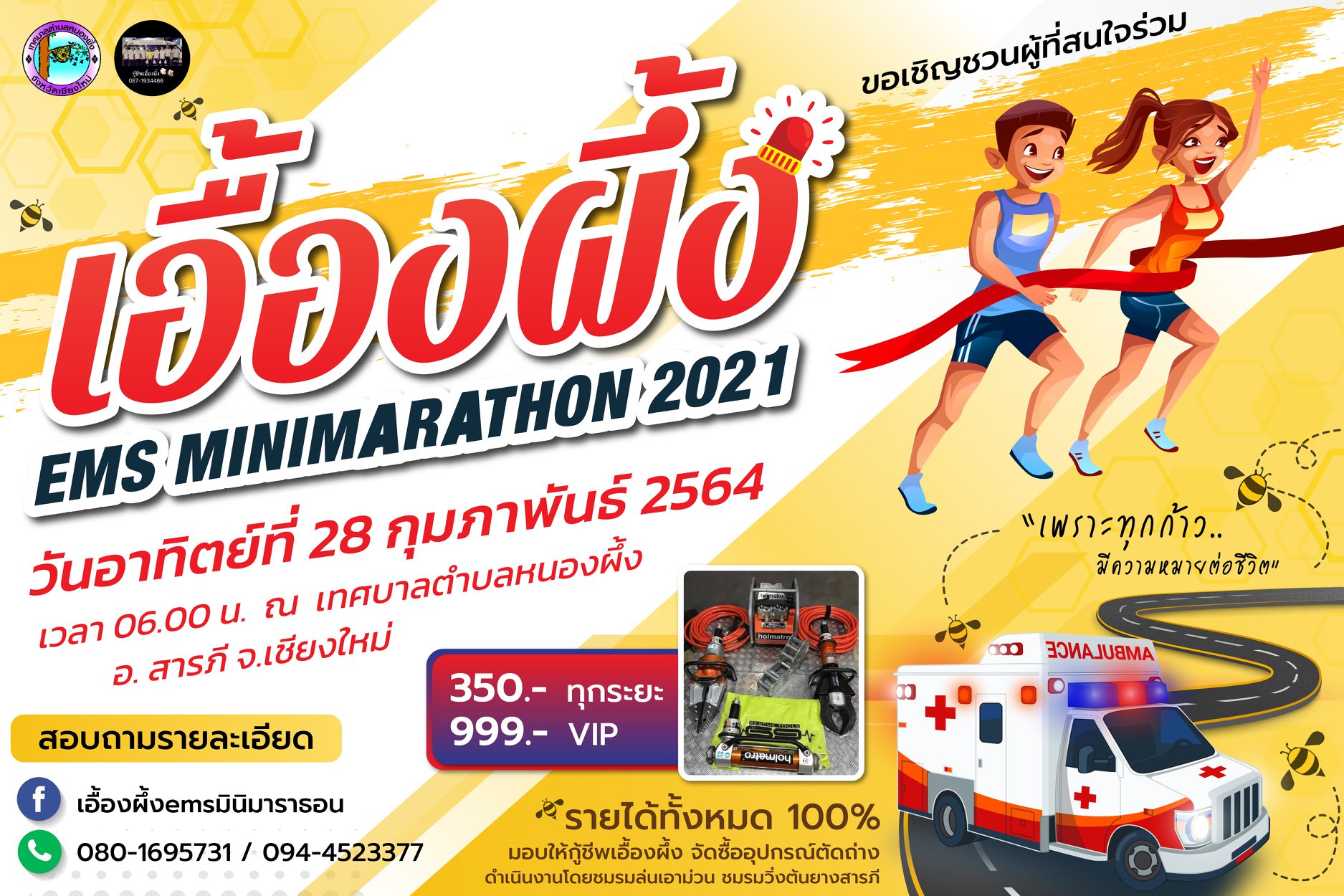งานวิ่งการกุศลรายได้ทั้งหมด 100% มอบให้กู้ชีพเอื้องผึ้ง จัดซื้ออุปกรณ์ตัดถ่าง “เอื้องผึ้งemsมินิมาราธอน 2021”