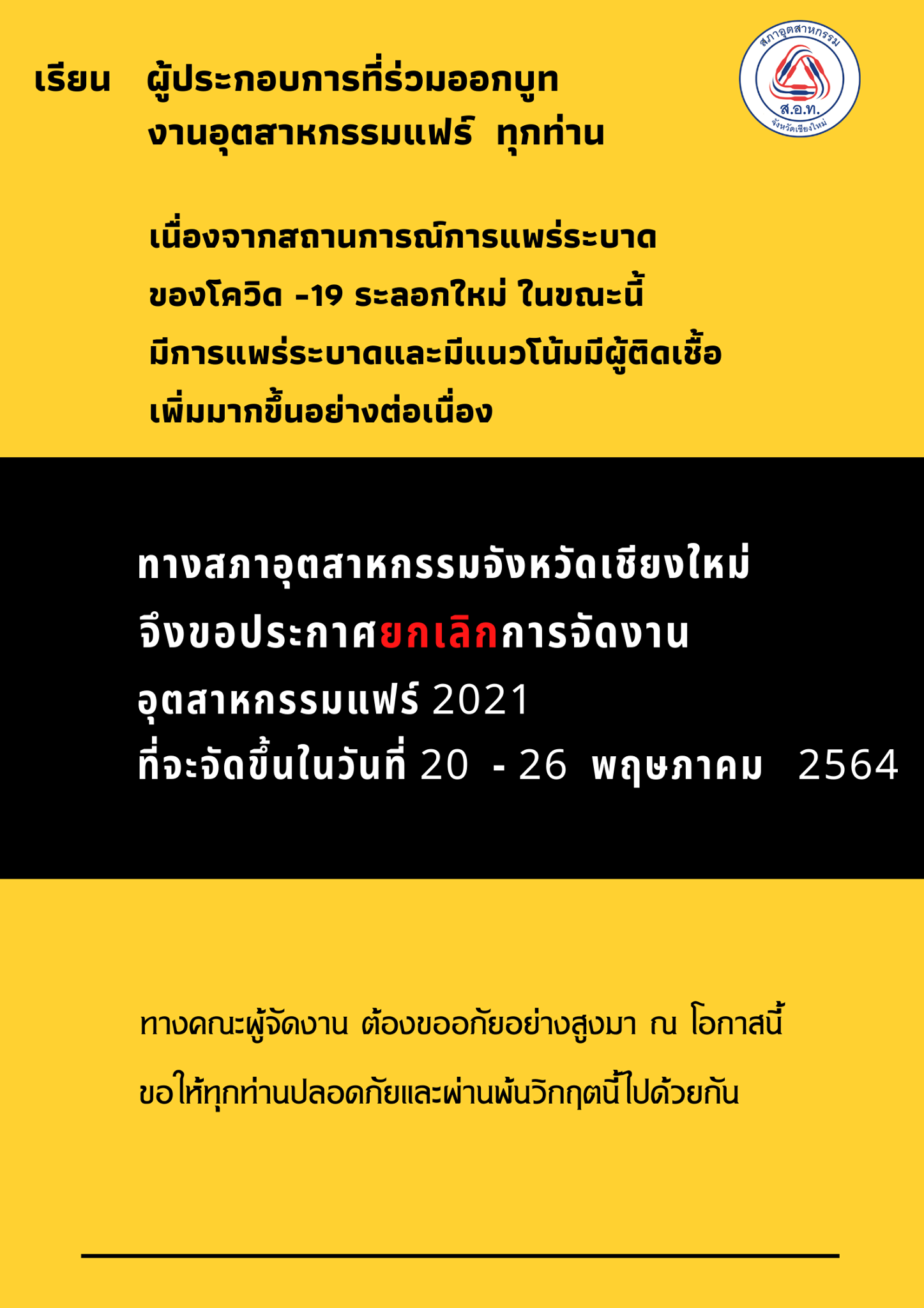 แจ้งยกเลิกการจัดงานอุตสาหกรรมแฟร์ 2021 ณ ศูนย์ส่งเสริมอุตสาหกรรมภาคที่ 1 จังหวัดเชียงใหม่