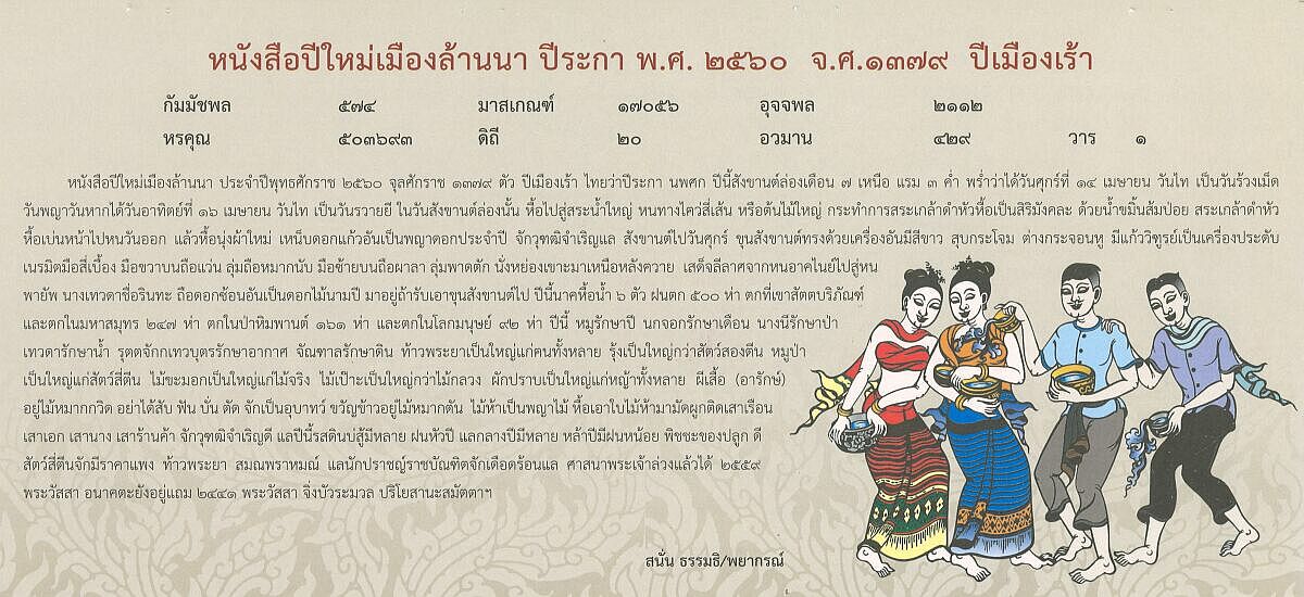 หนังสือปีใหม่ล้านนา ประจำปีพุทธศักราช ๒๕๖๐ จุลศักราช ๑๓๗๙ ตัว ปีเมืองเร้า ไทยว่าปีระกา นพศก ปีนี้สังขานต์ล่องเดือน ๗ เหนือ แรม ๓ ค่ำ พร่ำว่าได้วันศุกร์ที่ ๑๔ เมษายน วันไท เป็นวันร้วงเม็ด วันพญาวันหากได้วันอาทิตย์ที่ ๑๖ เมษายน วันไท เป็นวันรวายยี ในวันสังขานต์ล่องนั้น หื้อไปสู่สระน้ำใหญ่ หนทางไคว่สี่เส้น หรือต้นไม้ใหญ่ กระทําการสระเกล้าดําหัวหื้อเป็นสิริมังคล ด้วยน้ำขมิ้นส้มป่อย สระเกล้าดําหัว หื้อเบ่นหน้าไปหนวันออก แล้วหื้อนุ่งผ้าใหม่ เหน็บดอกแก้วอันเป็นพญาตอกประจําปี จักวุฑฒิจําเริญแล สังขานต์ไปวันศุกร์ ขุนสังขานต์ทรงด้วยเครื่องอันมีสีขาว สุบกระโจม ต่างกระจอนหู มีแก้ววิฑูรย์เป็นเครื่องประดับ เนรมิตมือสี่เบื้อง มือขวาบนถือแว่น ลุ่มถือหมากนับ มือซ้ายบนถือผาลา ลุ่มพาดตัก นั่งหย่องเขาะมาเหนือหลังควาย เสด็จลีลาศจากหนอาคไนย์ไปสู่หนพายัพ นางเทวดาชื่อรินทะ ถือดอกซ้อนอันเป็นดอกไม้นามปี มาอยู่ถ้ารับเอาขุนสังขานต์ไป ปีนี้นาคหื้อน้ำ 5 ตัว ฝนตก ๕๐๐ ห่า ตกที่เขาสัตตบริภัณฑ์ และตกในมหาสมุทร ๒๔๗ ห่า ตกในป่าหิมพานต์ ๑๖๑ ห่า และตกในโลกมนุษย์ ๙๒ ห่า ปีนี้ หมูรักษาปี นกจอกรักษาเดือน นางนีรักษาป่า เทวดารักษาน้ำ รุตตจักกเทวบุตรรักษาอากาศ จัณฑาลรักษาดิน ท้าวพระยาเป็นใหญ่แก่คนทั้งหลาย รุ้งเป็นใหญ่กว่าสัตว์สองตีน หมูป่าเป็นใหญ่แก่สัตว์สี่ตีน ไม้ขะมอกเป็นใหญ่แก่ไม้จริง ไม้เป๊าะเป็นใหญ่กว่าไม้กลวง ผักปราบเป็นใหญ่แก่หญ้าทั้งหลาย ผีเสื้อ (อารักษ์) อยู่ไม้หมากกวิด อย่าได้สับ ฟัน ปั่น ตัด จักเป็นอุบาทว์ ขวัญข้าวอยู่ไม้หมากตัน ไม้ห้าเป็นพญาไม้ ซื้อเอาใบไม้ห้ามามัดผูกติดเสาเรือน เสาเอก เสานาง เสาร้านค้า จักวุฑฒิจําเริญดี แลปีนี้รสดินบ่สู้มีหลาย ฝนหัวปี แลกลางปีมีหลาย หล้าปีมีฝนหน้อย พิชชะของปลูก ดี – สัตว์สี่ตีนจักมีราคาแพง ท้าวพระยา สมณพราหมณ์ แลนักปราชญ์ราชบัณฑิตจักเดือดร้อนแล ศาสนาพระเจ้าล่วงแล้วได้ ๒๕๕๙ พระวัสสา อนาคตะยังอยู่แถม ๒๕๔๑ พระวัสสา จิ่งบัวระมวล ปริโยสานะสมัตตาฯ