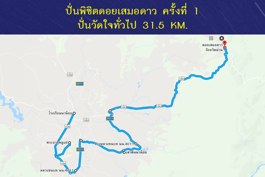 การเดินทางมาร่วมกิจกรรม ปั่นการกุศลพิชิตดอยเสมอดาวที่ อ.นาน้อย จ.น่าน ทางรถยนต์จากกรุงเทพมหานคร ระยะทางประมาณ 657 กิโลเมตร