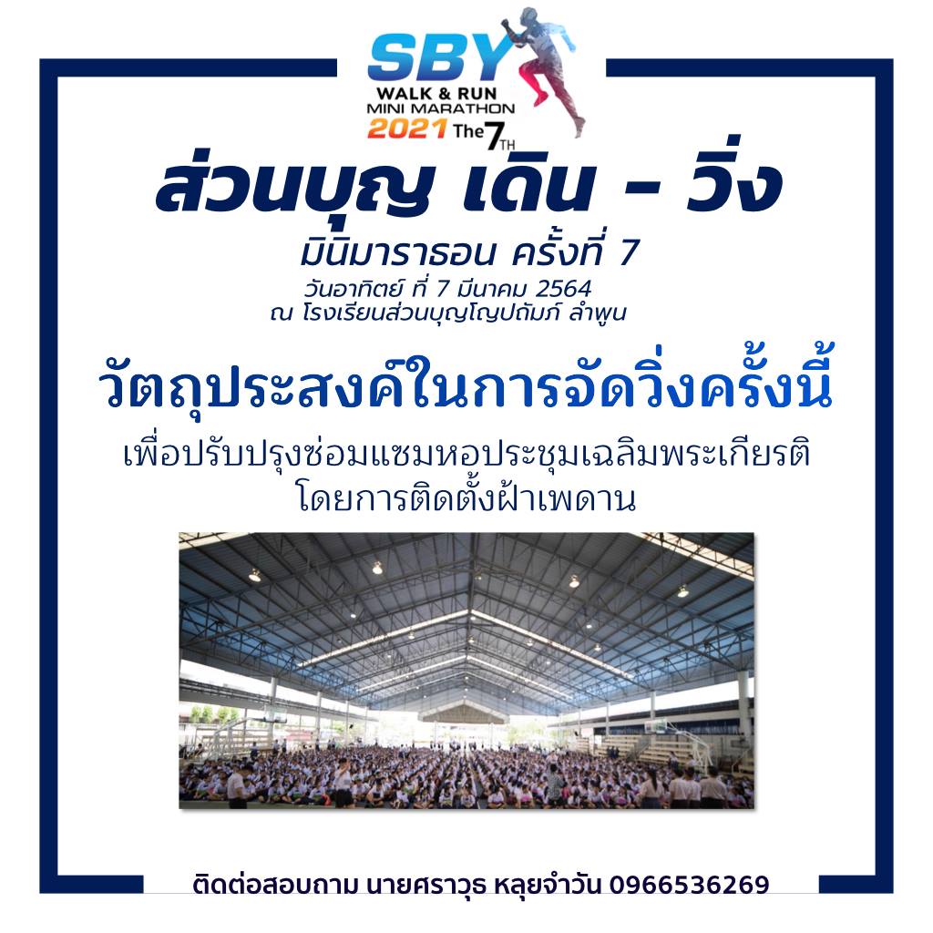 ส่วนบุญ เดิน – วิ่ง มินิมาราธอน ครั้งที่ 7 (SBY Mini Marathon 2021 th7) วันอาทิตย์ที่ 7 มีนาคม 2564 ณ โรงเรียนส่วนบุญโญปถัมภ์ ตำบลในเมือง อำเภอเมืองลำพูน จังหวัดลำพูน