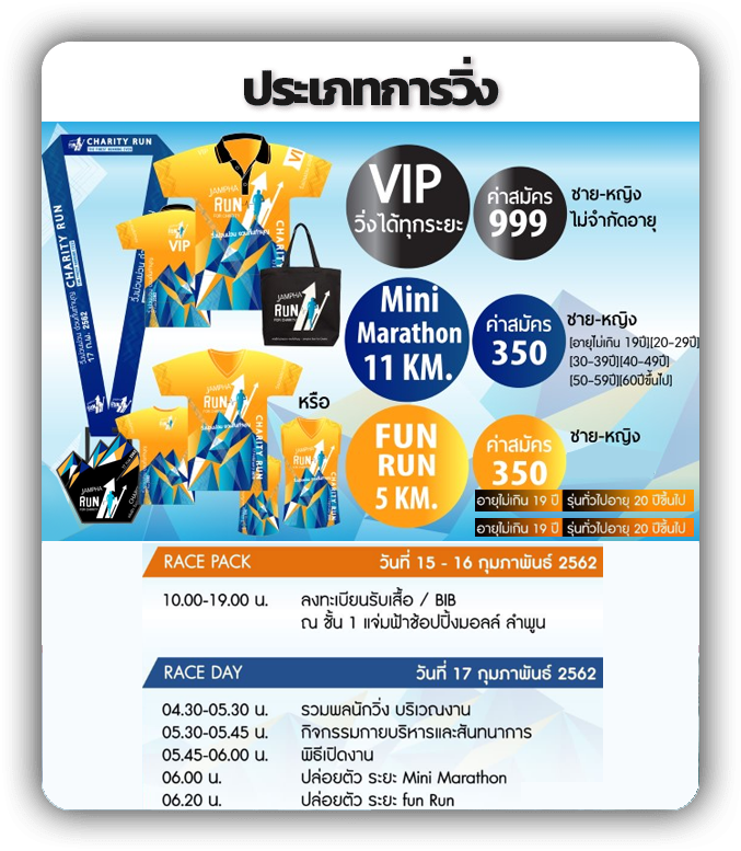 งานวิ่ง “แจ่มฟ้าวิ่งม่วนม่วน จวนกั๋นทำบุญ 2019” Jampha Run For Charity 2019 วันอาทิตย์ที่ 17 กุมภาพันธ์ 2562 จัดขึ้น เพื่อจัดหารายได้สนับสนุนการจัดซื้ออุปกรณ์การแพทย์ให้กับโรงพยาบาลจังหวัดลำพูน